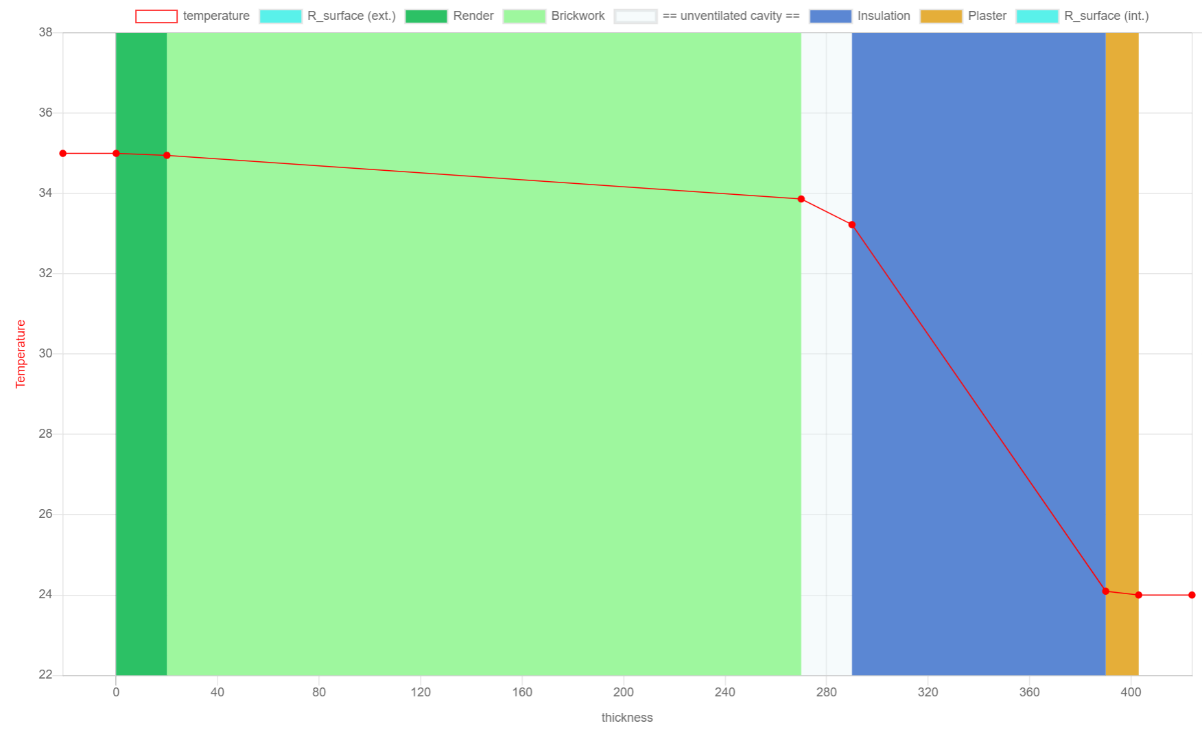 - Layer 2: Brickwork Rlayer = 0.298 \(K·m^2 \over W\), Touter = 34.95 °C, Tinner = 33.86 °C